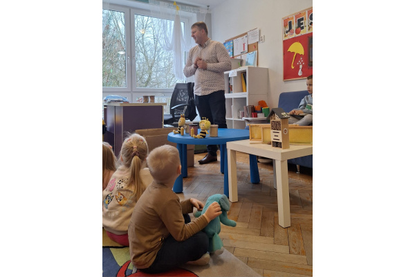 Z okazji Dnia Pluszowego Misia gościliśmy w naszym przedszkolu Pana Łukasza z Psieki "Dary Krajny". Podczas zajęć dzieci pogłębiły wiedzę dotyczącą pszczół, ich roli w ulu oraz codziennych zwyczajach. Pan pszczelarz pokazał ramki z miodem, a także elementy z których zbudowany jest ul. Na zakończenie spotkania pobudziliśmy swoje kubki smakowe pysznym miodem cytrynowym.