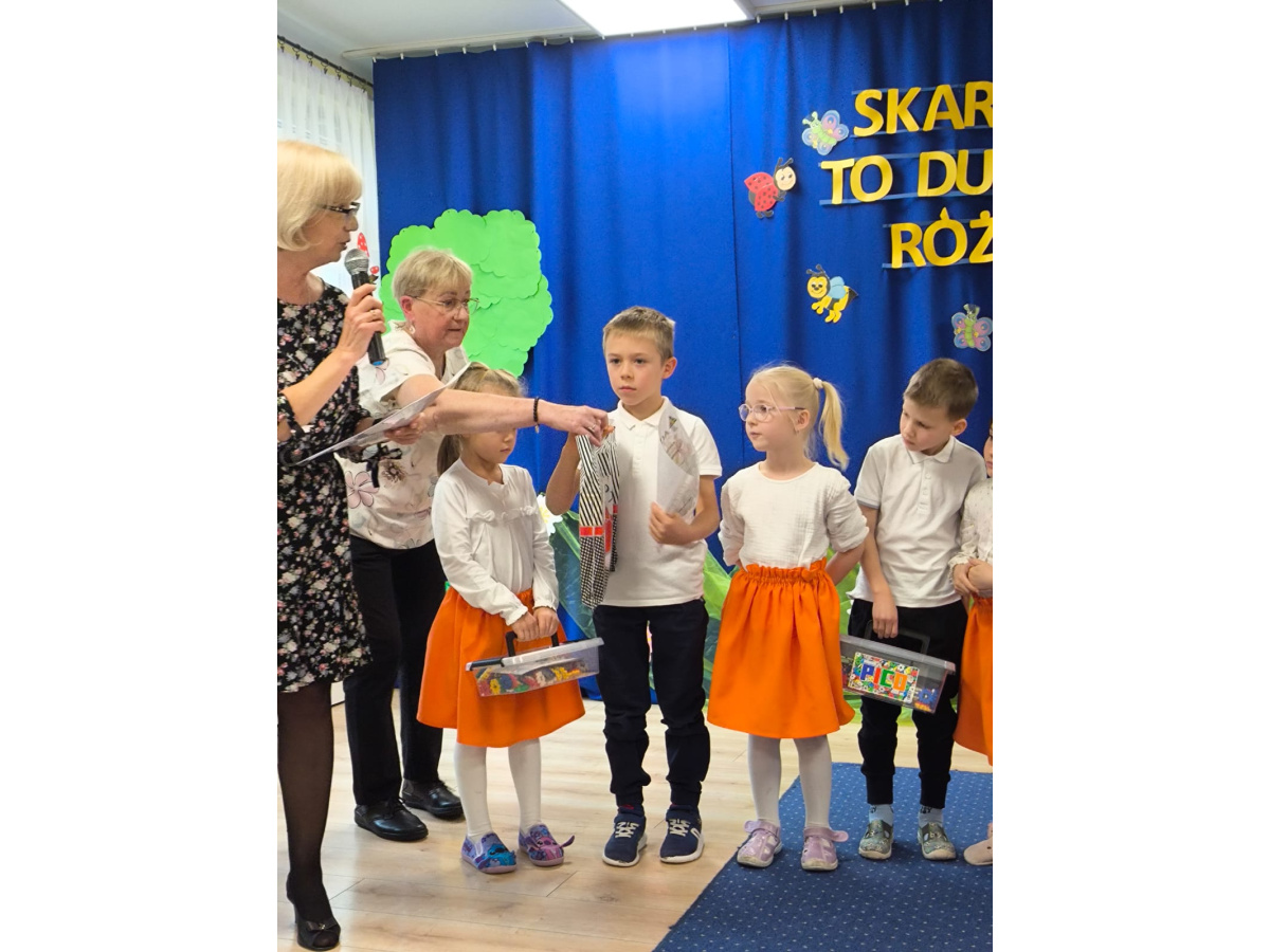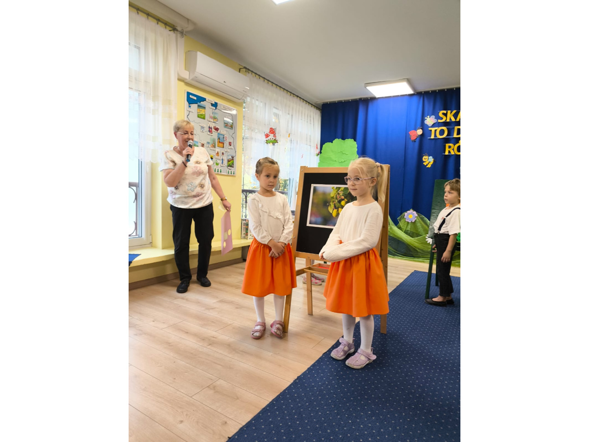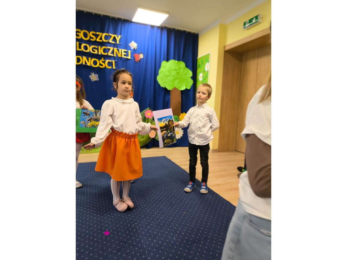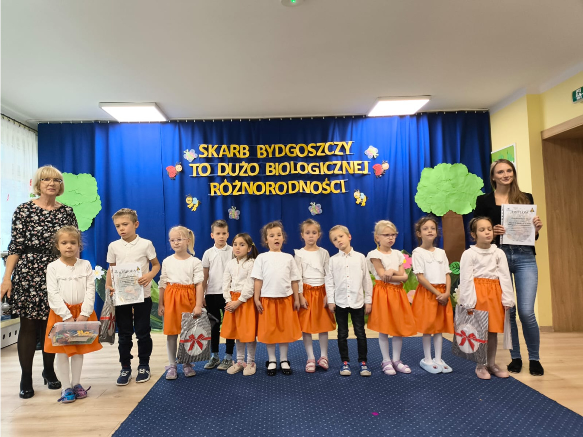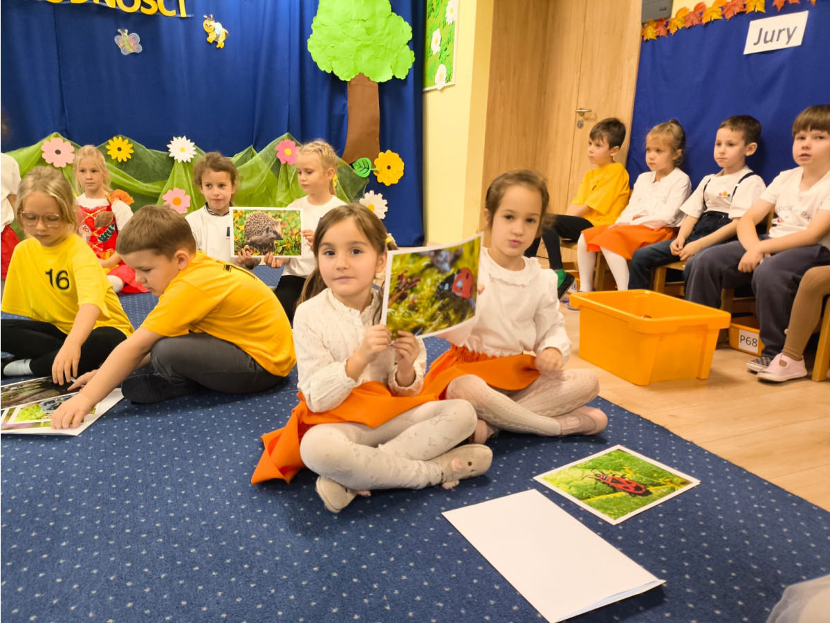 Dnia 28.10.2025 dzieci z grupy Sowy, wzięły udział w Bydgoskim Grancie Ekologicznym " Skarb Bydgoszczy to dużo biologicznej różnorodności " realizowanym przez Przedszkole nr 16 w Bydgoszczy. Zadaniem naszych dzieci bylo rozwiązanie zagadek słownych, rozszyfrowanie zakodowanego hasła, ułożenie puzzli, rozpoznanie i nazwanie gatunków drzew po fragmencie ilustracji a także zaprezentowanie swoich zdolności artystycznych. Nasze przedszkolaki poradziły sobie z zadaniami śpiewająco.