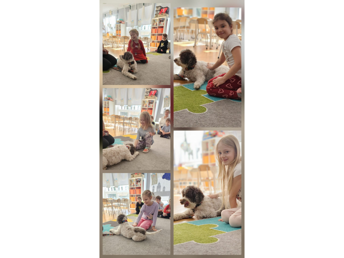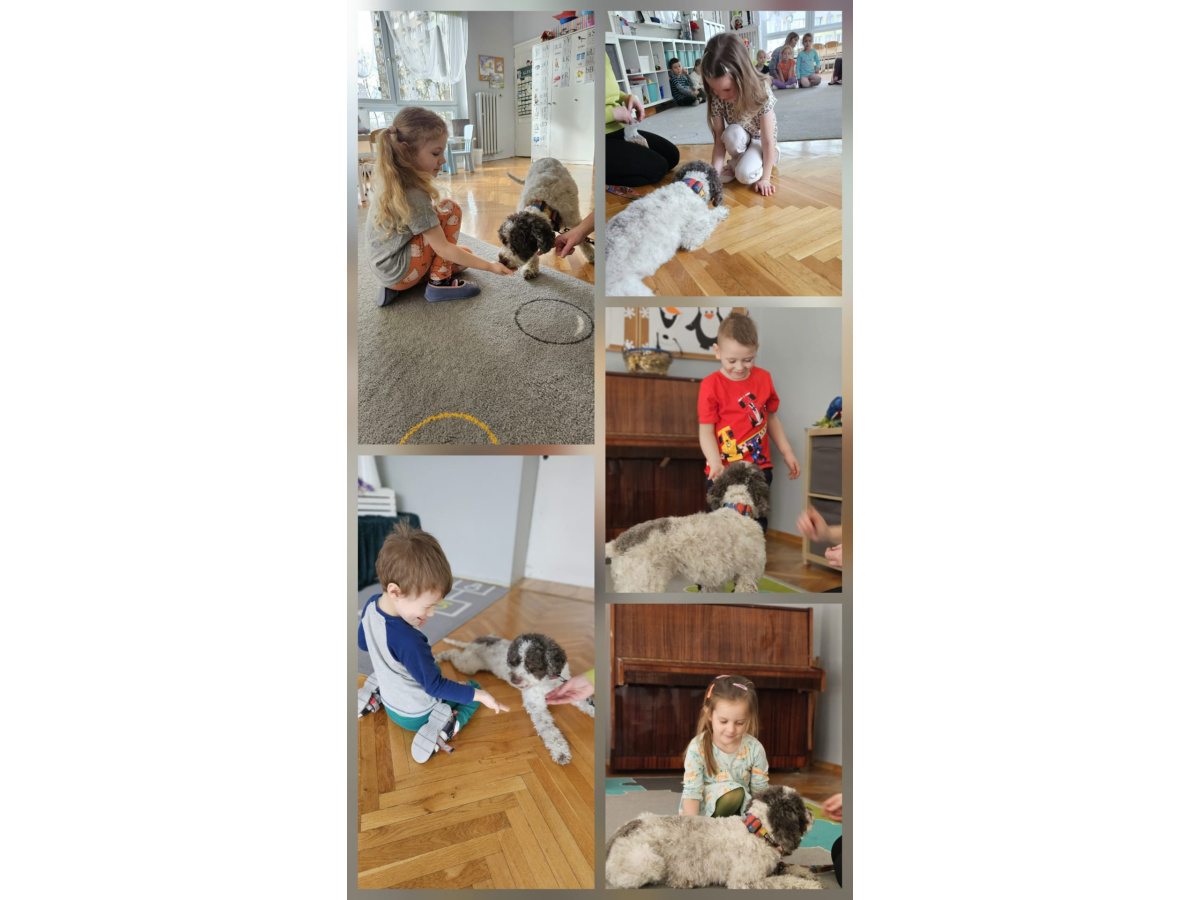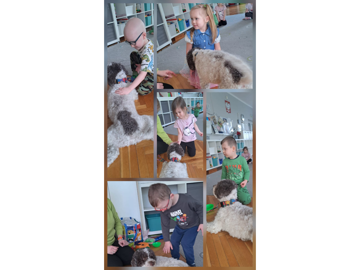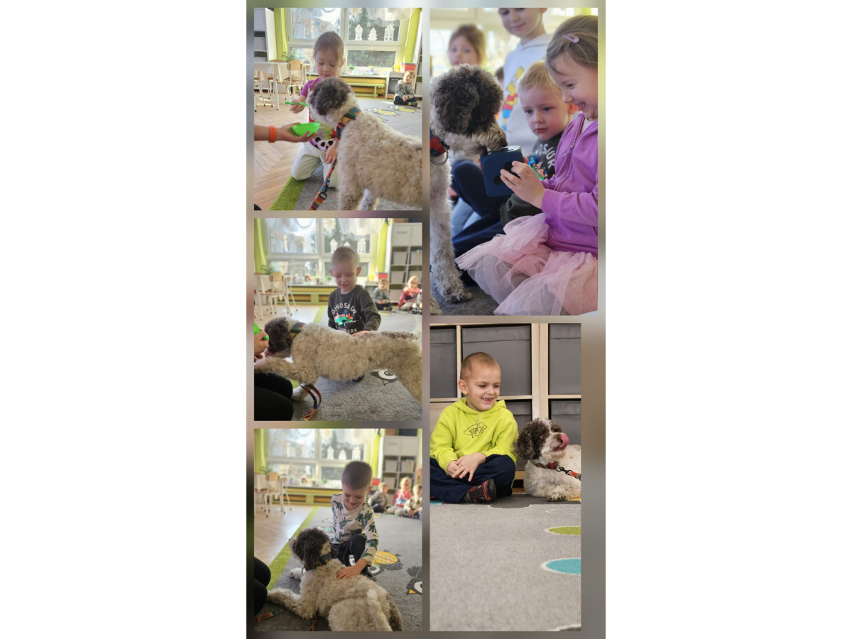 Z radością informujemy, że w naszym przedszkolu odbyły się zajęcia z dogoterapii. Spotkanie z psem-terapeutą dostarczyło dzieciom wielu pozytywnych emocji, uśmiechu i niezapomnianych wrażeń. Dzieci z ogromnym zaangażowaniem brały udział w proponowanych aktywnościach, ucząc się jednocześnie empatii, odpowiedzialności oraz właściwego kontaktu ze zwierzętami.