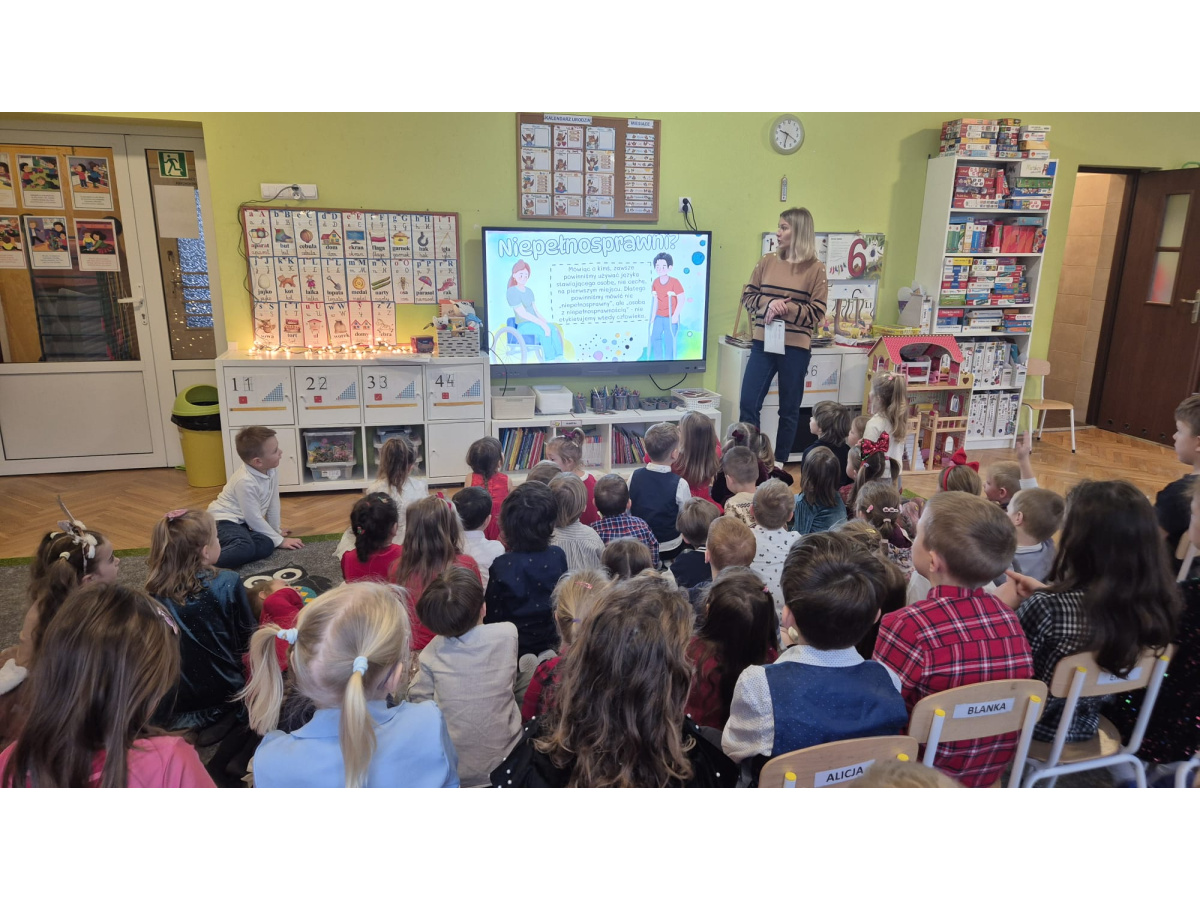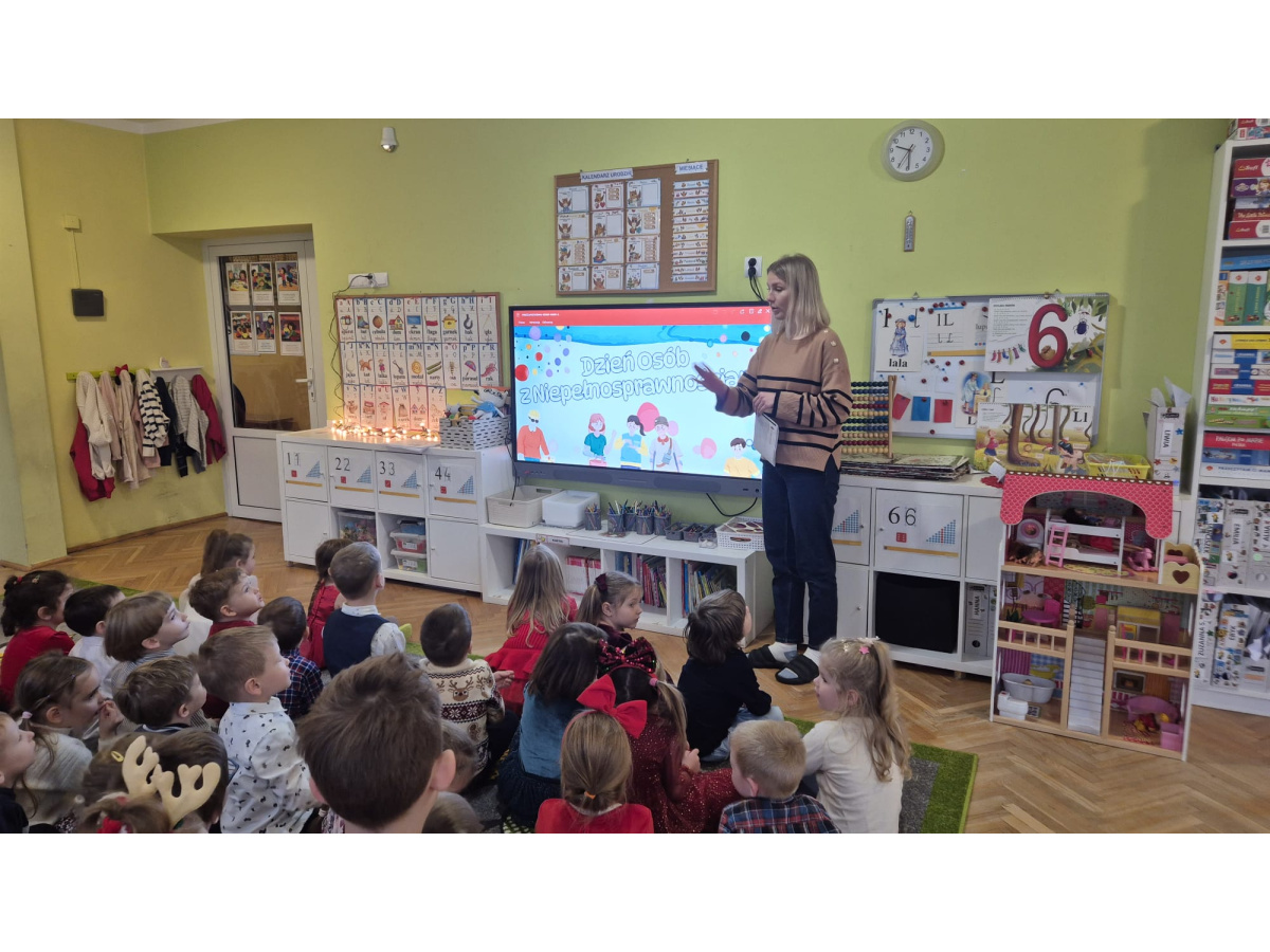 Pedagog specjalny zorganizował zajęcia z okazji Międzynarodowego Dnia Osób z Niepełnosprawnościami. Dzieci podczas zajęć rozmawiały o tym, że każdy człowiek jest inny i wyjątkowy. Przedszkolaki uczyły się, jak ważna jest empatia, szacunek i pomoc innym. Dzieci chętnie brały udział w zajęciach i zadawały wiele pytań. Spotkanie było dla przedszkolaków wartościową lekcją wrażliwości i tolerancji.