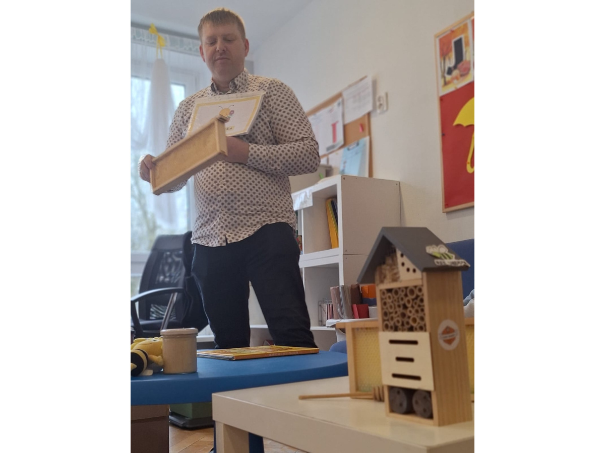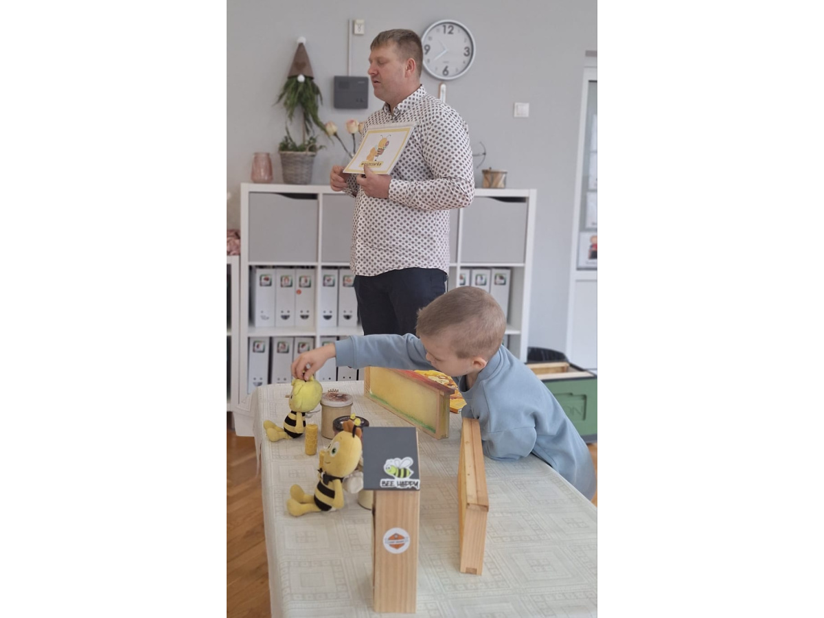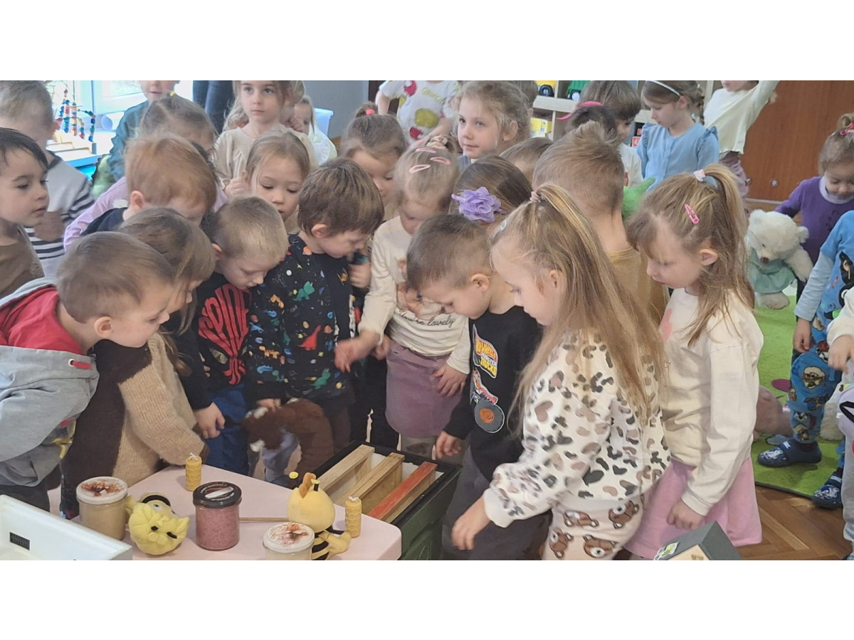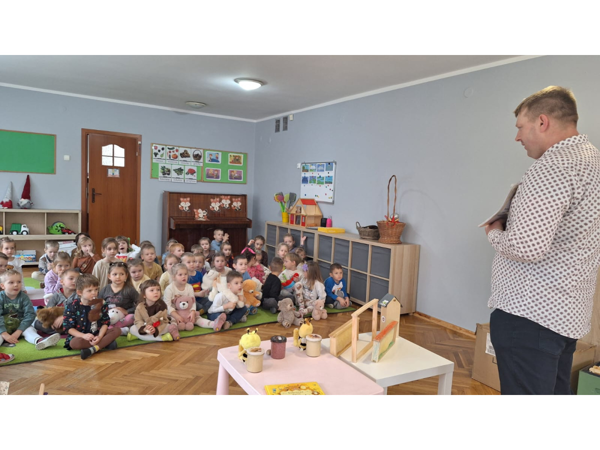 Z okazji Dnia Pluszowego Misia gościliśmy w naszym przedszkolu Pana Łukasza z Psieki "Dary Krajny". Podczas zajęć dzieci pogłębiły wiedzę dotyczącą pszczół, ich roli w ulu oraz codziennych zwyczajach. Pan pszczelarz pokazał ramki z miodem, a także elementy z których zbudowany jest ul. Na zakończenie spotkania pobudziliśmy swoje kubki smakowe pysznym miodem cytrynowym.