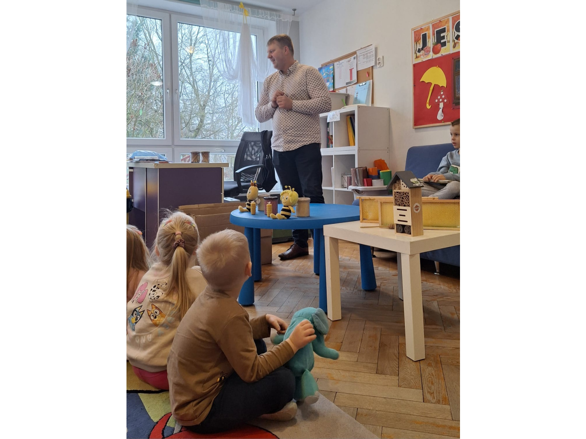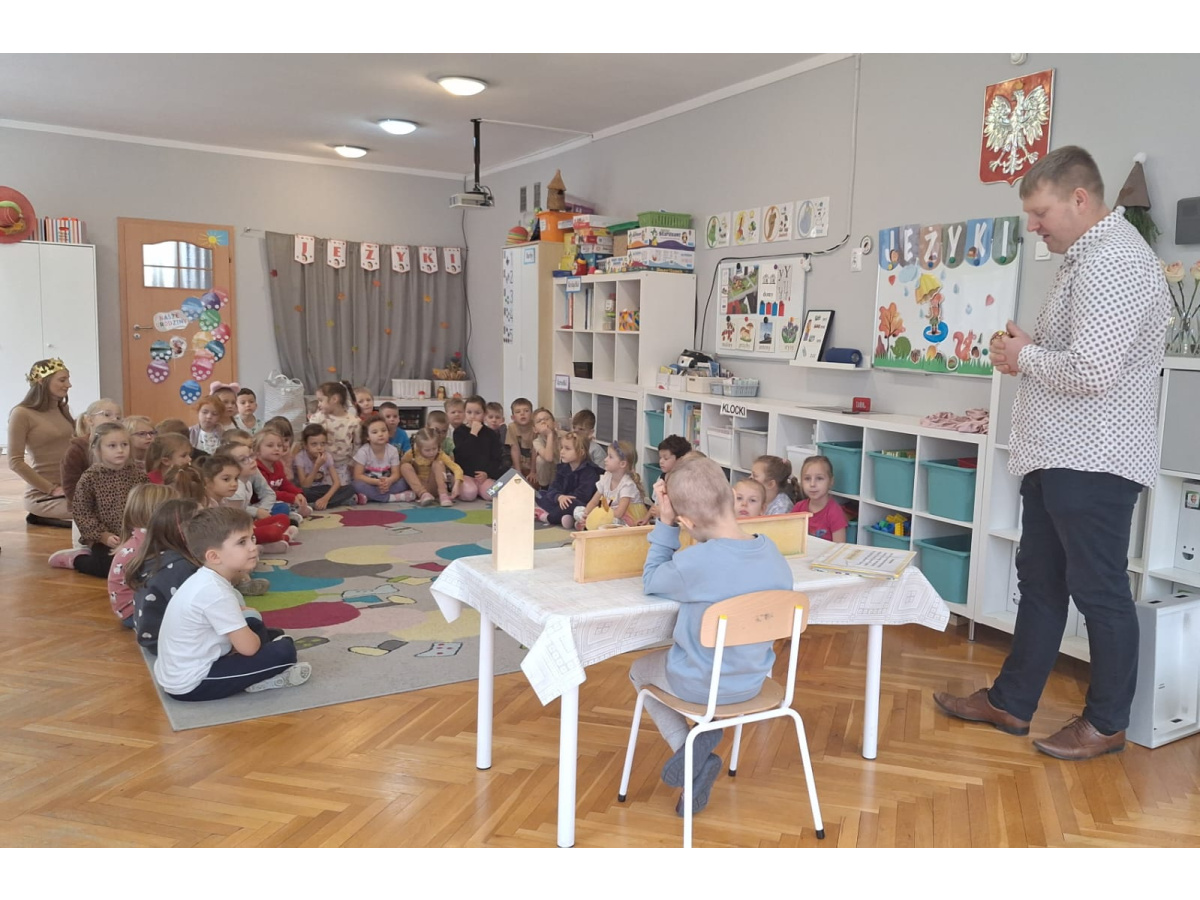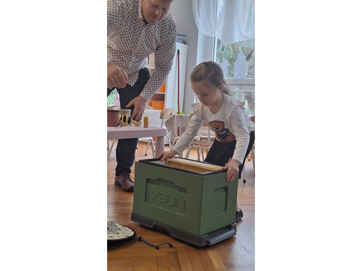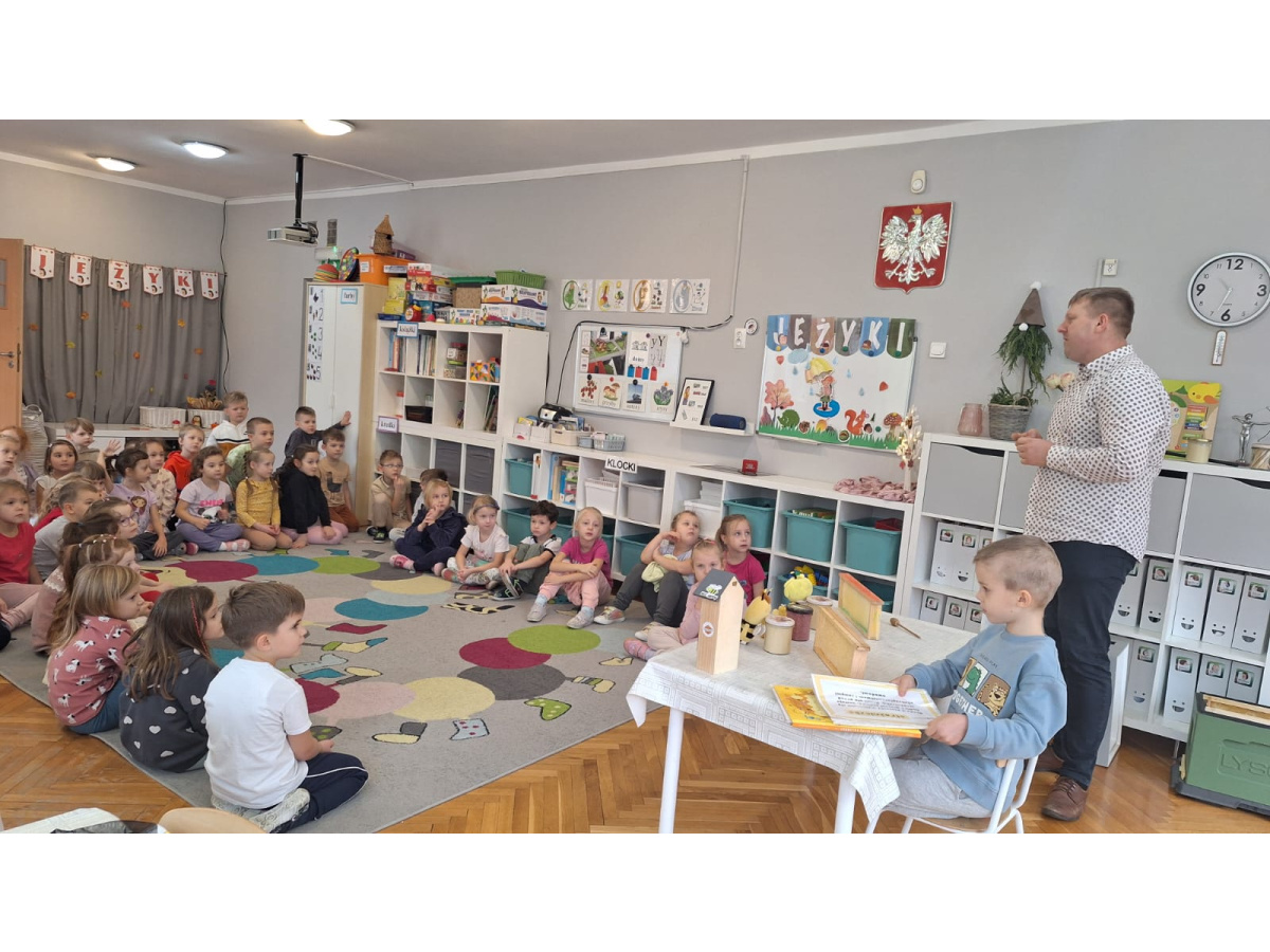 Z okazji Dnia Pluszowego Misia gościliśmy w naszym przedszkolu Pana Łukasza z Psieki "Dary Krajny". Podczas zajęć dzieci pogłębiły wiedzę dotyczącą pszczół, ich roli w ulu oraz codziennych zwyczajach. Pan pszczelarz pokazał ramki z miodem, a także elementy z których zbudowany jest ul. Na zakończenie spotkania pobudziliśmy swoje kubki smakowe pysznym miodem cytrynowym.
