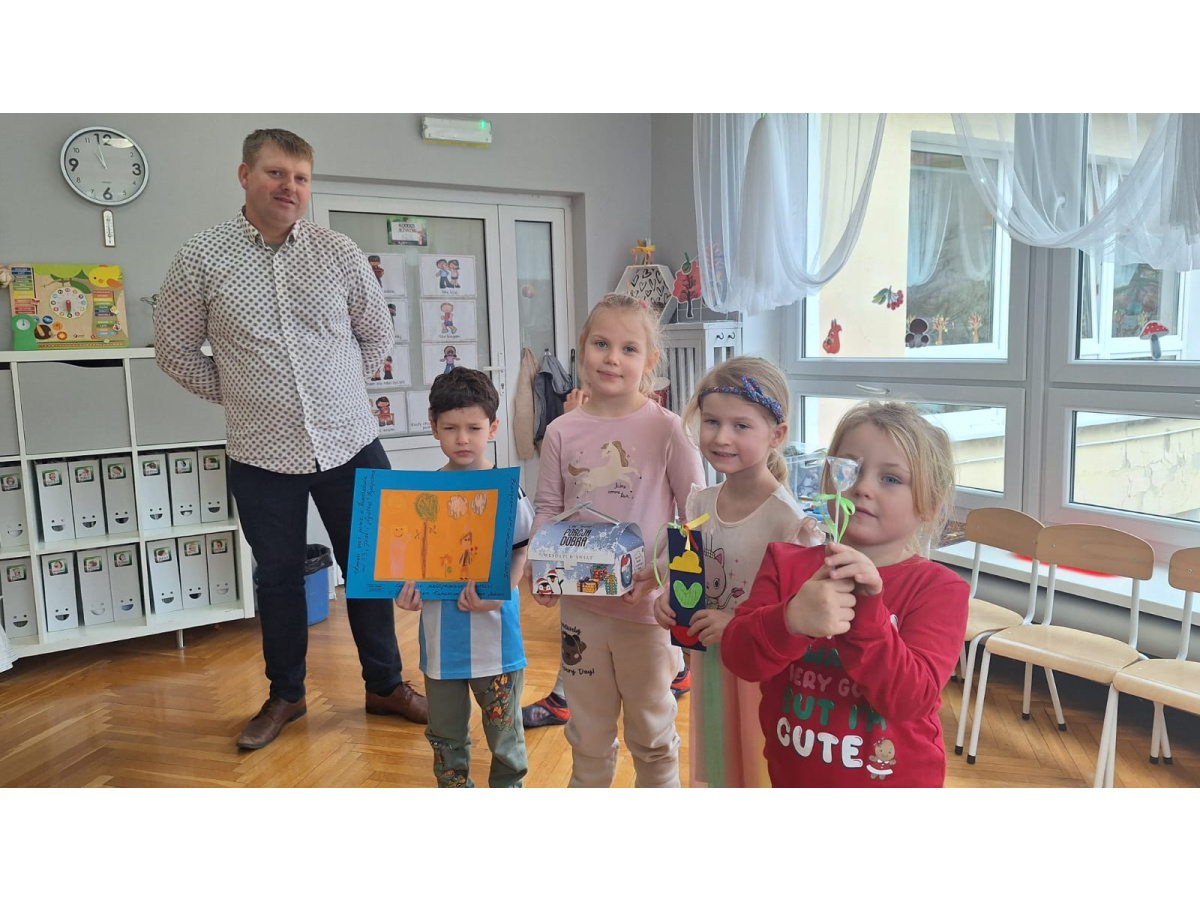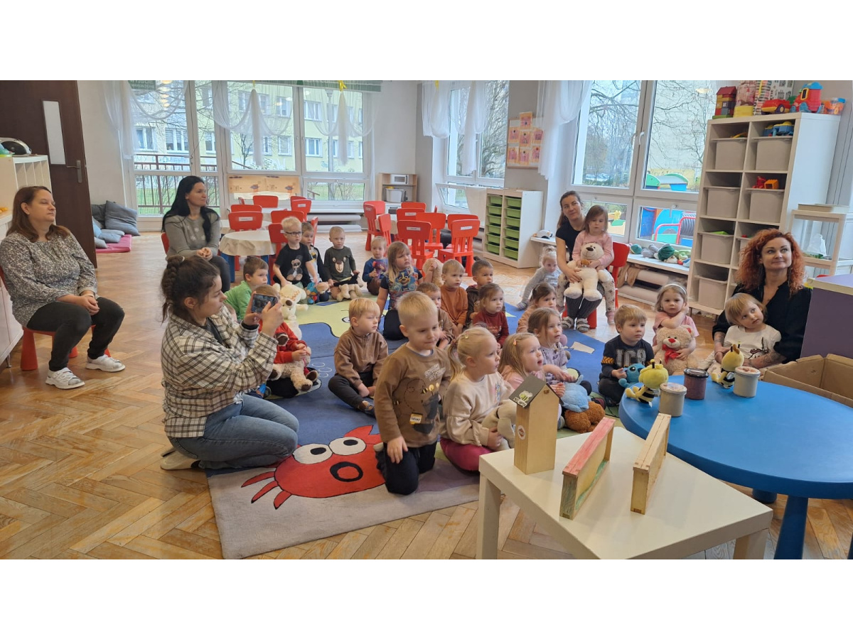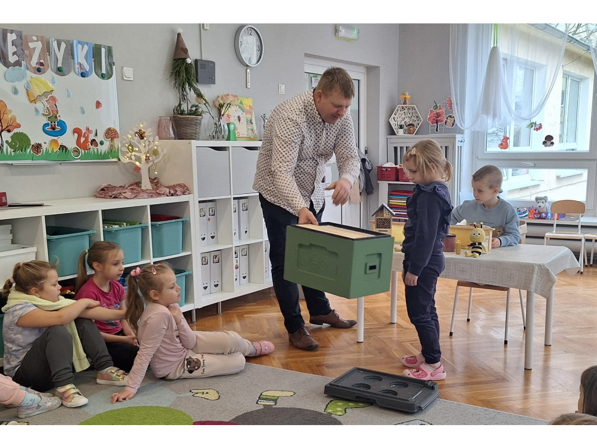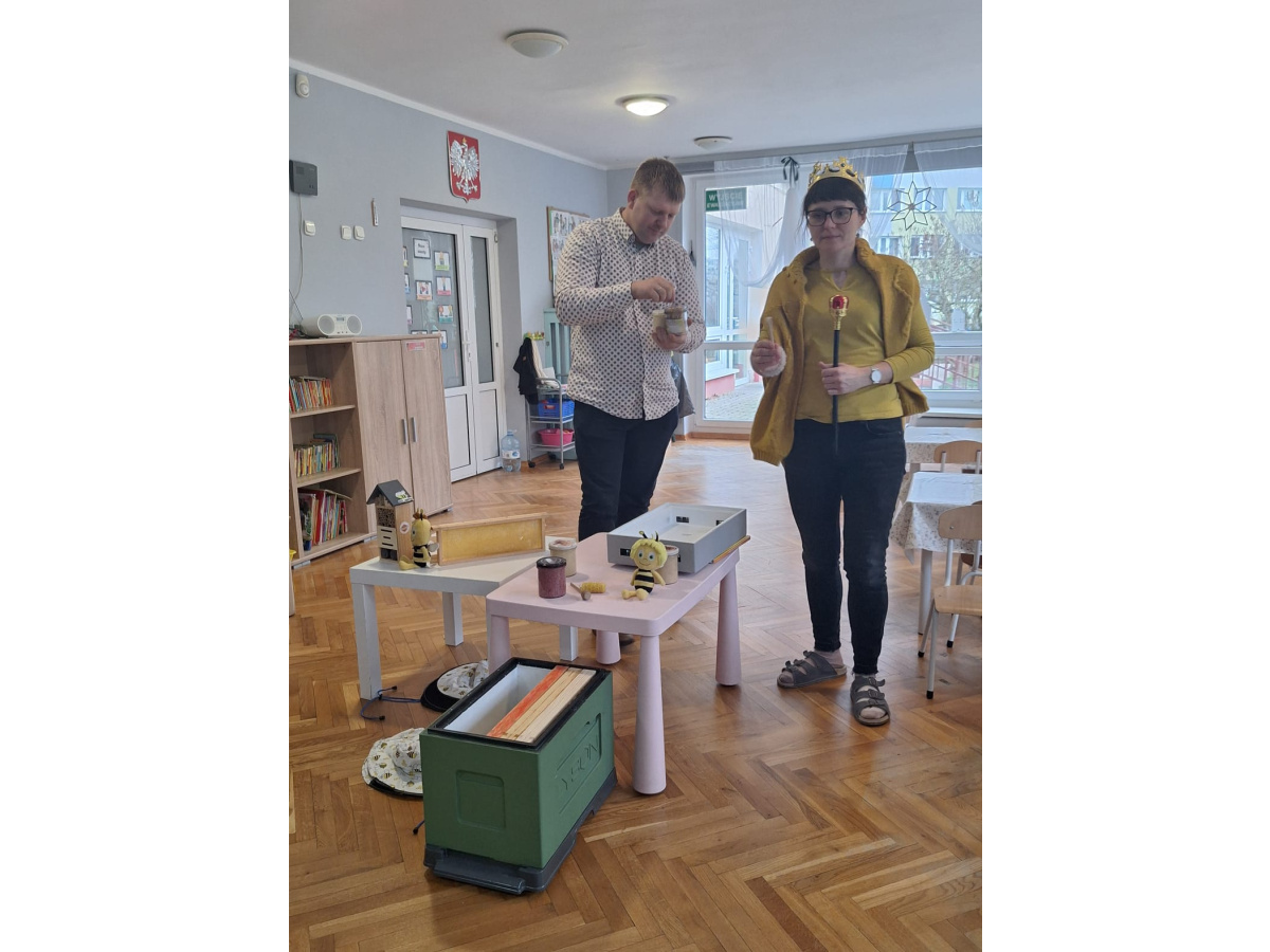 Z okazji Dnia Pluszowego Misia gościliśmy w naszym przedszkolu Pana Łukasza z Psieki "Dary Krajny". Podczas zajęć dzieci pogłębiły wiedzę dotyczącą pszczół, ich roli w ulu oraz codziennych zwyczajach. Pan pszczelarz pokazał ramki z miodem, a także elementy z których zbudowany jest ul. Na zakończenie spotkania pobudziliśmy swoje kubki smakowe pysznym miodem cytrynowym.