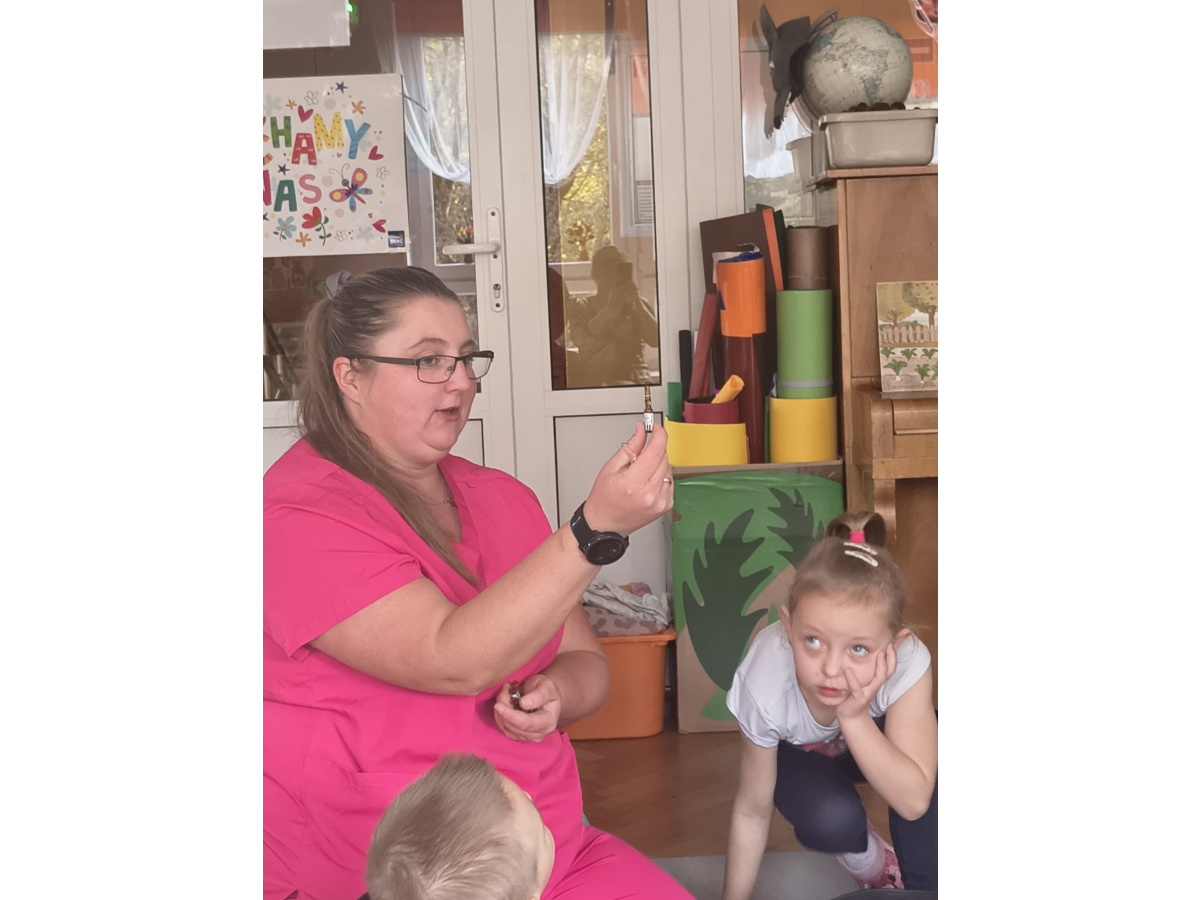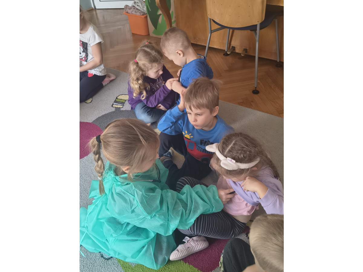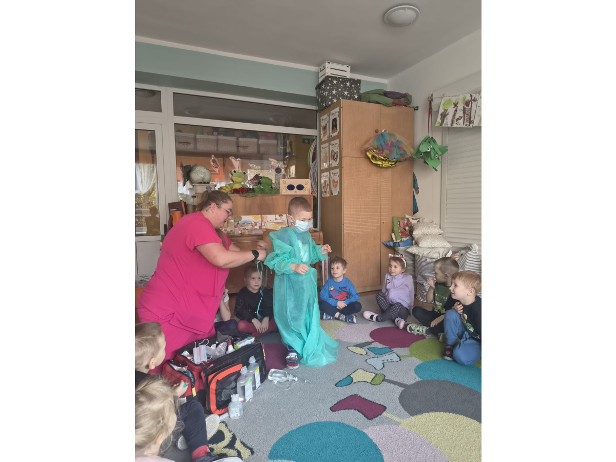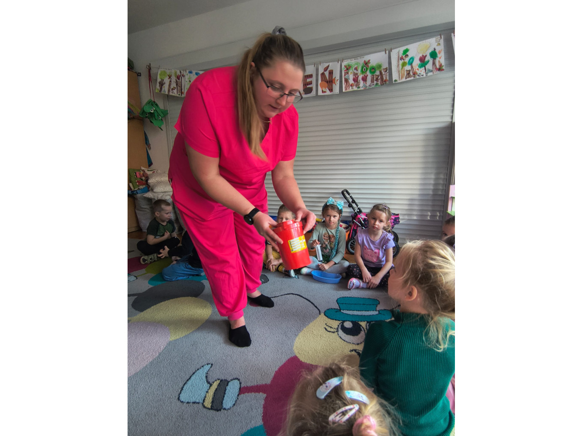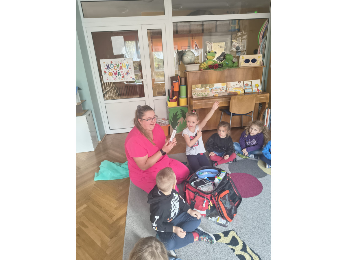 21 października przybył do naszego przedszkola niecodzienny gość- mama Marcelinki i Eryka- Pani Milena, która z zawodu jest pielęgniarką. W bardzo ciekawy sposób opowiedziała nam czym zajmuje się pielęgniarka, na czym polega jej praca oraz gdzie można spotkać pielęgniarki. Pani Milena zaprezentowała dzieciom przedmioty niezbędne do wykonywania tego zawodu i wyjaśniła do czego służą. Przedszkolaki z grupy III i IV miały okazję obejrzeć strzykawki, bandaże, ciśnieniomierz, pulsoksymetr i stetoskop. Dzieci mogły posłuchać bicia serca, zabandażować nogę lub rękę swojego kolegi. Pokonały lęk przed zabiegami medycznymi, a przede wszystkim wzbogaciły i utrwaliły wiadomości na temat sposobów dbania o swoje zdrowie.