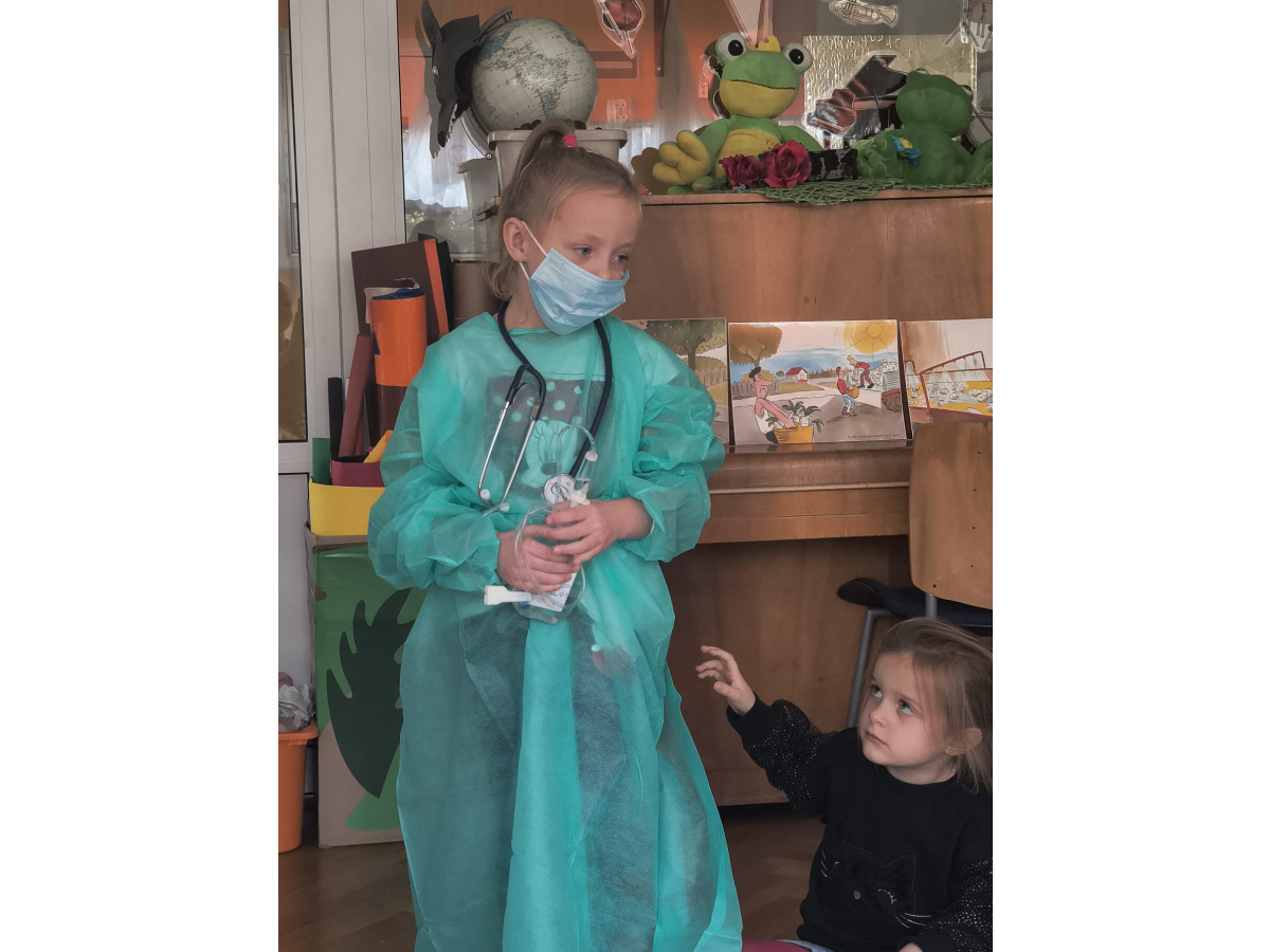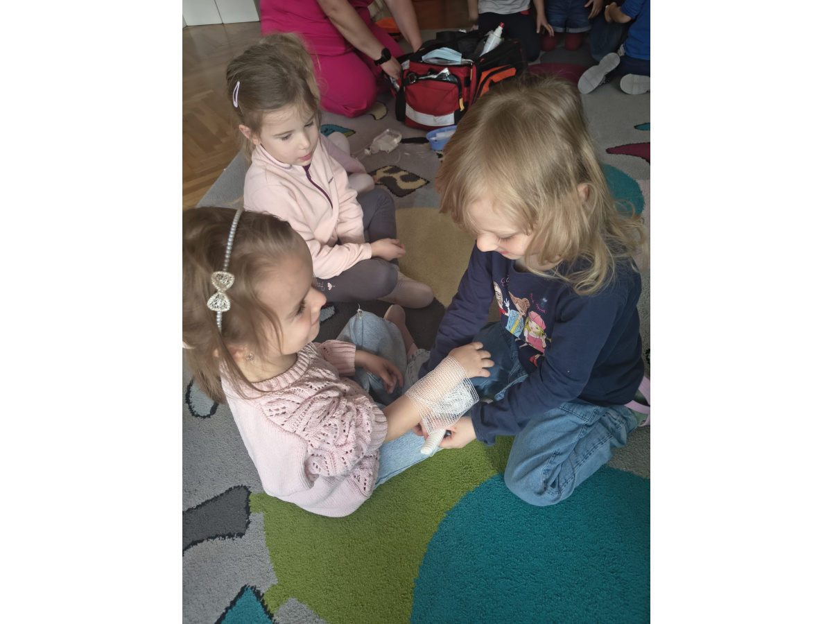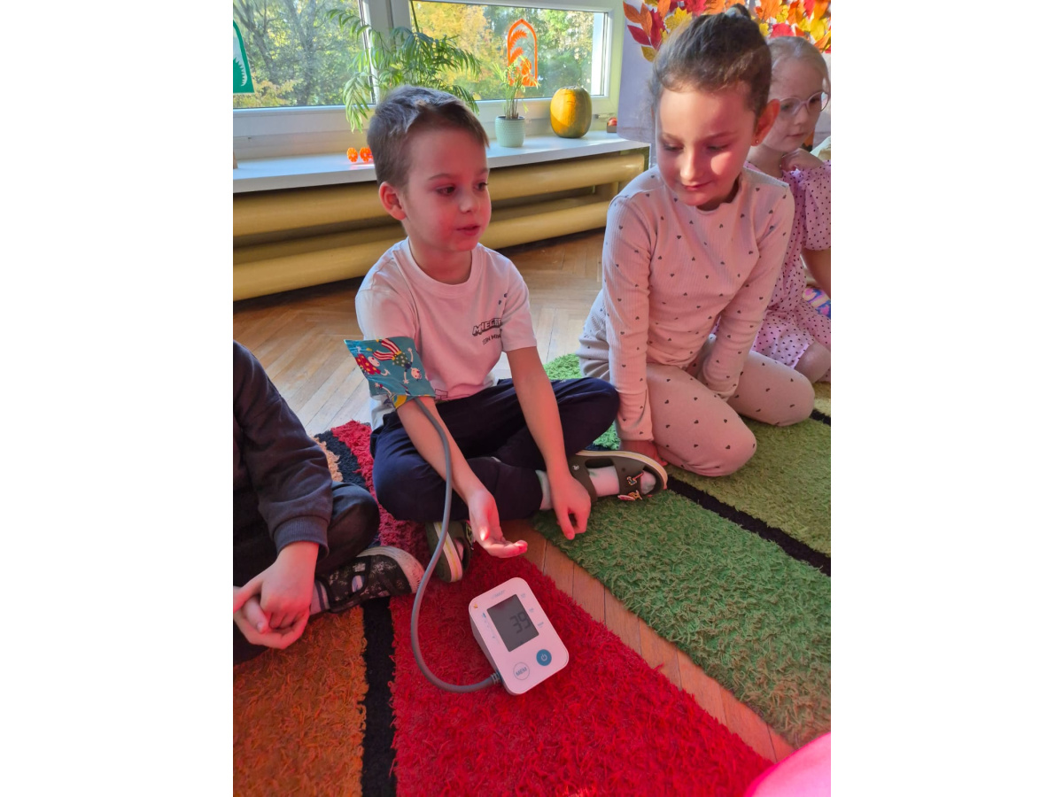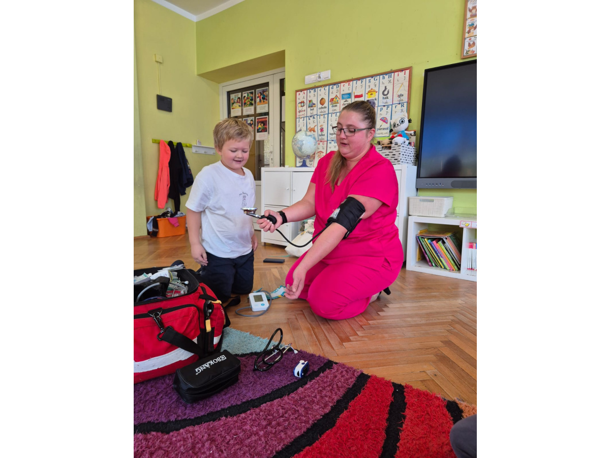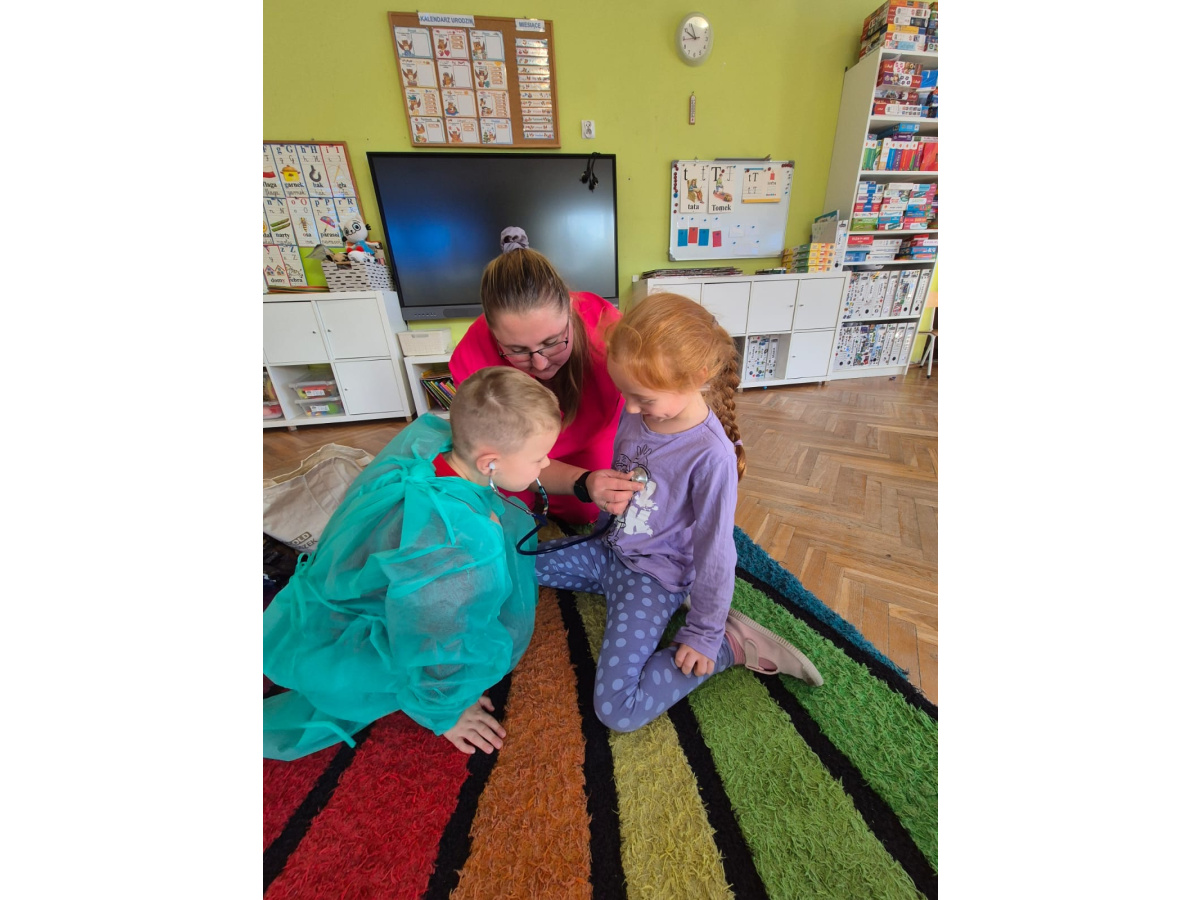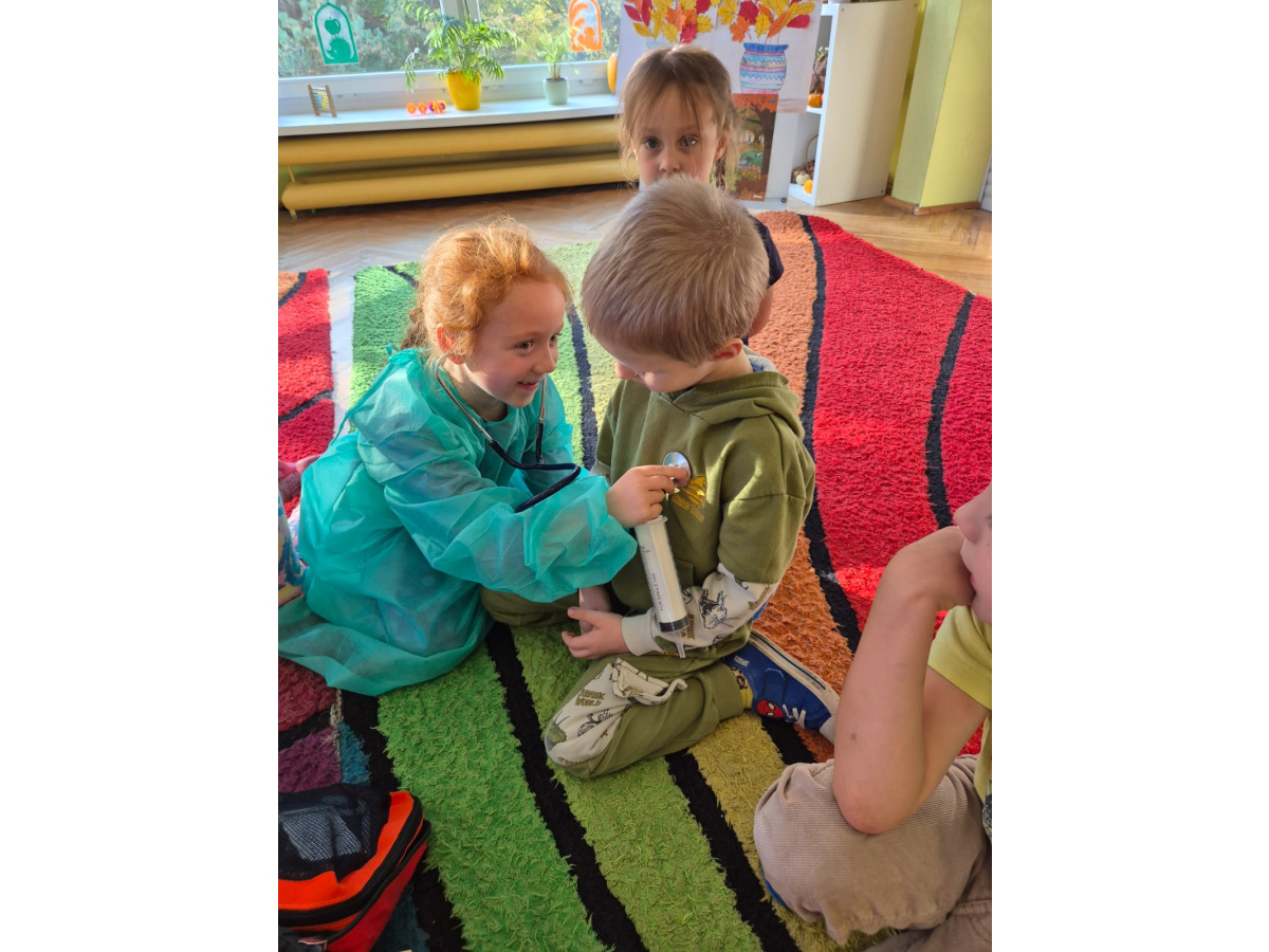 21 października przybył do naszego przedszkola niecodzienny gość- mama Marcelinki i Eryka- Pani Milena, która z zawodu jest pielęgniarką. W bardzo ciekawy sposób opowiedziała nam czym zajmuje się pielęgniarka, na czym polega jej praca oraz gdzie można spotkać pielęgniarki. Pani Milena zaprezentowała dzieciom przedmioty niezbędne do wykonywania tego zawodu i wyjaśniła do czego służą. Przedszkolaki z grupy III i IV miały okazję obejrzeć strzykawki, bandaże, ciśnieniomierz, pulsoksymetr i stetoskop. Dzieci mogły posłuchać bicia serca, zabandażować nogę lub rękę swojego kolegi. Pokonały lęk przed zabiegami medycznymi, a przede wszystkim wzbogaciły i utrwaliły wiadomości na temat sposobów dbania o swoje zdrowie.