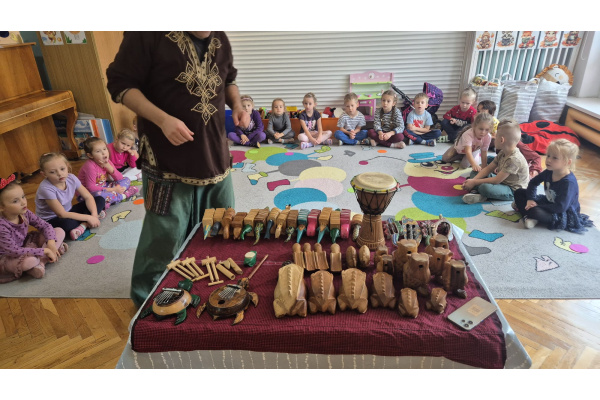 Dzieci miały okazję usłyszeć instrumenty, które brzmiały jak odgłos burzy - burzownica i padający deszcz - kij deszczowy.